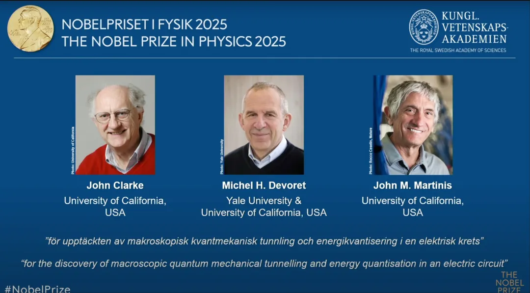 刚刚,2025年诺贝尔物理学奖公布,三位量子物理学家约翰·克拉克(John Clarke)、米歇尔·德沃雷(Michel H. Devoret)与约翰·马丁尼斯(John Martinis),因其“在电路中发现了宏观量子隧穿效应和能级量子化”而获奖。