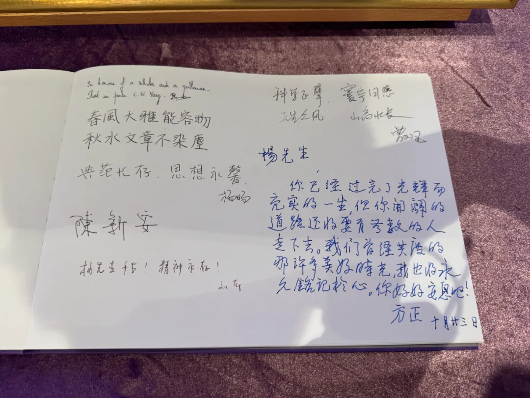 图为杨振宁挚友陈方正在吊唁室留言簿上写给杨振宁先生的话:“杨先生,你已经过完了光辉而充实的一生,但你开辟的道路还将要有无数的人走下去。我们曾经共度的那许多美好时光,我也将永远铭记在心。你好好安息吧!”拍摄:陈晓雪