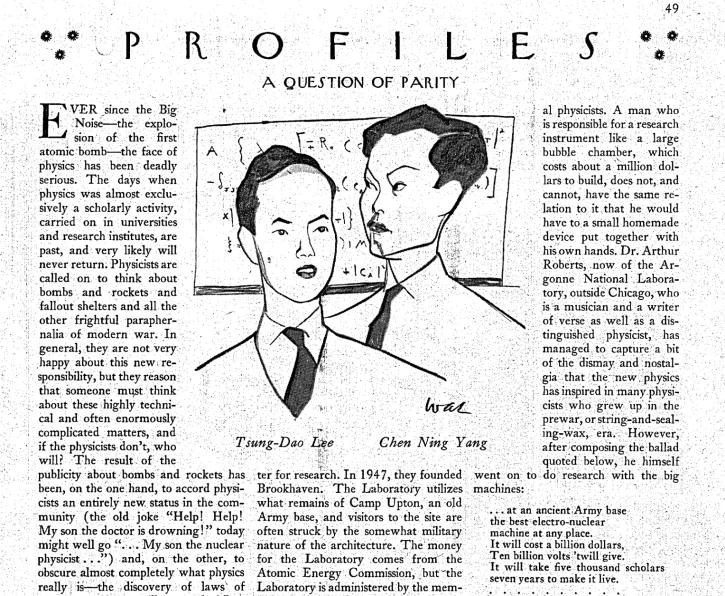 [1] Bernstein, J. A Question of Parity. New Yorker. 12 May, 1962: 49-104.