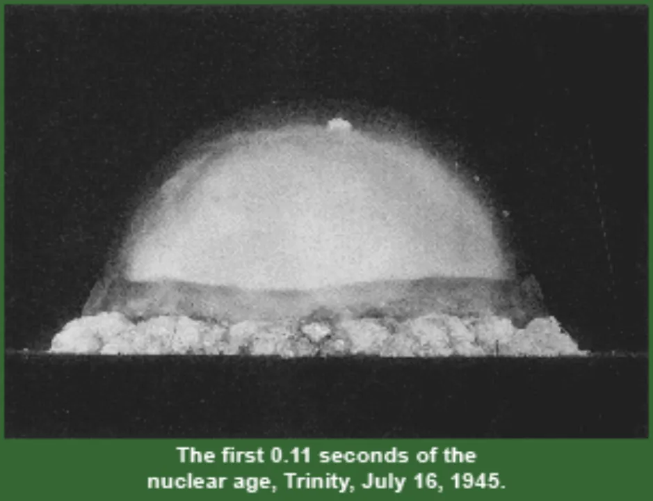 1945年7月16日清晨5:30,试验核弹被引爆。霎时,整个天空被不可思议的亮光照亮,爆炸发出的光线,从最初的紫色转为绿色,再转为白色,爆炸产生的蘑菇云高达十余公里。