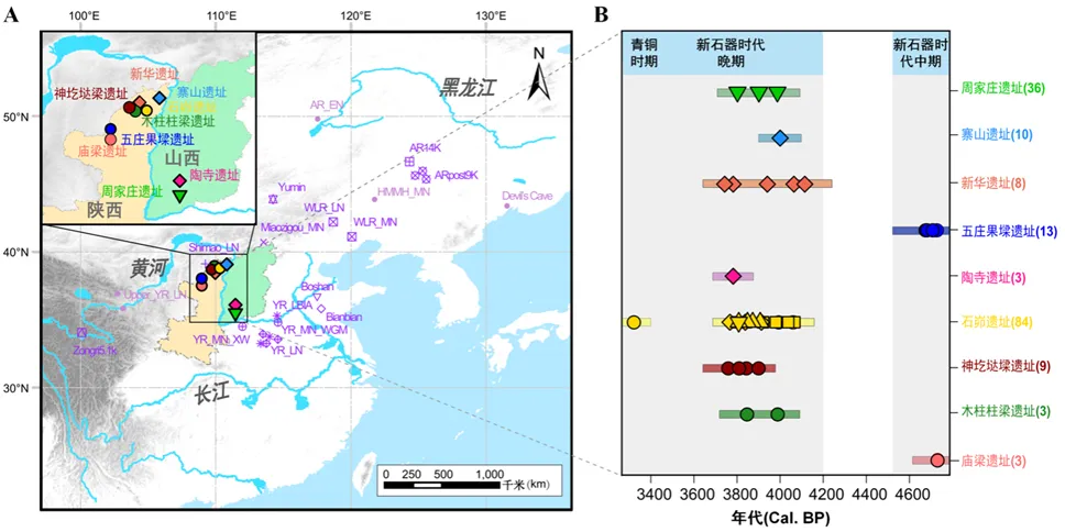 为阐明石峁社会的人群起源和亲属关系实践,研究者对新石器时代中晚期到青铜时代的九个遗址进行了密集的基因组采样,从毛乌素沙漠到陕西、山西两省黄河下游的黄土高原地区,这些遗址覆盖多种史前文化(仰韶文化、石峁文化和陶寺文化)。