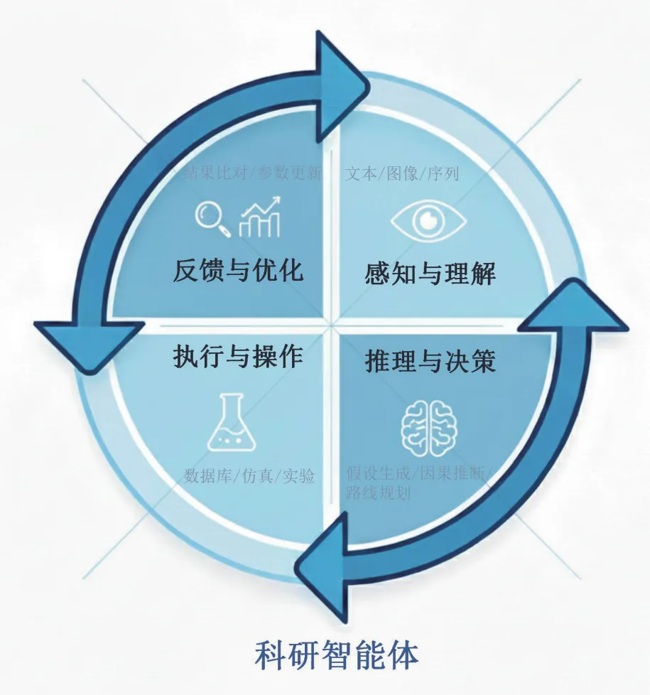 综合所述,我们可以对“科研智能体”(或称“人工智能科学家”)给出一个初步的定义:一个能够围绕科学目标,能够在多模态知识/数据条件下进行推理决策,并通过标准化接口自主或协作地能执行科研任务、在反馈中自我优化的人工智能系统。其核心能力如图1所示,包括感知与理解(文本、图像、序列等多模态)、推理与决策(假设生成、因果推断、路线规划)、执行与操作(数据库/仿真/实验等工具与设备)、反馈与优化(结果比对、参数更新、计划重排)。