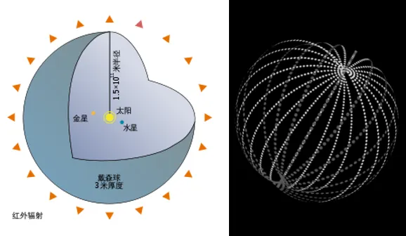 随着现代天文学的飞速进步,科学家已逐步厘清戴森球的物理可行性。牛津大学人类未来研究所研究员斯图尔特·阿姆斯特朗(Stuart Armstrong)指出[4],实心球壳式戴森球因重力不稳定、材料强度不足难以实现,戴森云或戴森泡更具现实可能。科学家测算,构建半径1个天文单位的戴森泡仅需月球质量1/350的物质,即2.17×10²⁰ kg,这为高级文明建造此类能源结构提供了理论基础和现实可行性。