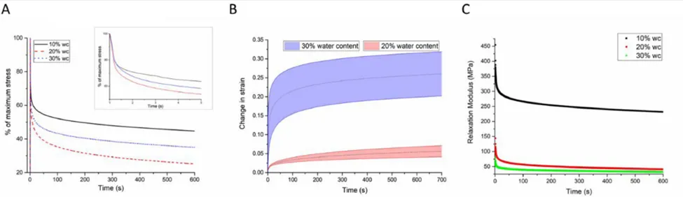 压缩状态下,蹄壁表现出随水合程度变化的粘弹性行为。A) 归一化松弛数据与时间的关系曲线,插图为初始松弛阶段。B) 水合程度为20%和30%的蹄样本蠕变测试结果。C) 各水合状态下的松弛模量随时间变化曲线。图源:参考文献 5