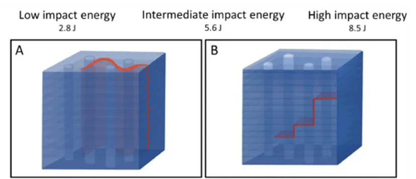 不同冲击能量下的失效机制示意图。描绘了裂纹在微管界面(低和中等冲击能量)和片层界面(高冲击能量)处的偏转。图源:参考文献5