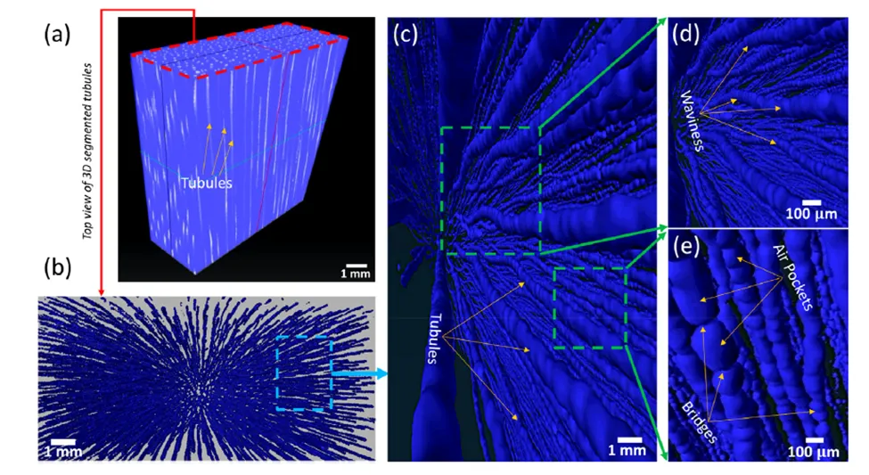 蹄壁样本的3D X射线显微CT可视化图像:a) 蹄壁样本的3D重建图; b) 3D分割后的微管髓腔俯视图;c) 微管髓腔纵视图,显示其平行排列;d) 放大视图,显示微管呈现周期性波浪状结构;e) 进一步放大视图,突出显示髓腔的非连续结构及管桥的存在。图源:参考文献4