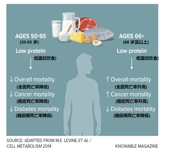 根据观察性研究,蛋白质需求随年龄变化,低蛋白饮食的效果也是如此。在50-65岁成年人中,低蛋白饮食与全因*[译者注3]及癌症死亡率下降相关;但在66岁及以上人群中,该饮食虽然与糖尿病死亡风险降低相关,却与更高的癌症及其他死因风险相关。