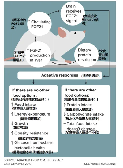 路易斯安那州彭宁顿生物医学研究中心的生理学家克里斯托弗·莫里森(Christopher Morrison)指出,低蛋白带来的长寿效应并非仅仅因为身体缺乏构建组织的原料。这背后存在着更具策略性的机制。莫里森团队研究了一种由肝脏产生的名为FGF21的激素。当蛋白质供应不足时,FGF21似乎会向大脑发出信号:“嘿!饮食里的蛋白质不够了!”。可如果通过基因工程使小鼠缺失FGF21,它们在面对低蛋白饮食时不仅不会长寿,反而死得更早!换句话说,只有当大脑接收到信号并调整身体反应时,低蛋白才能延长寿命。