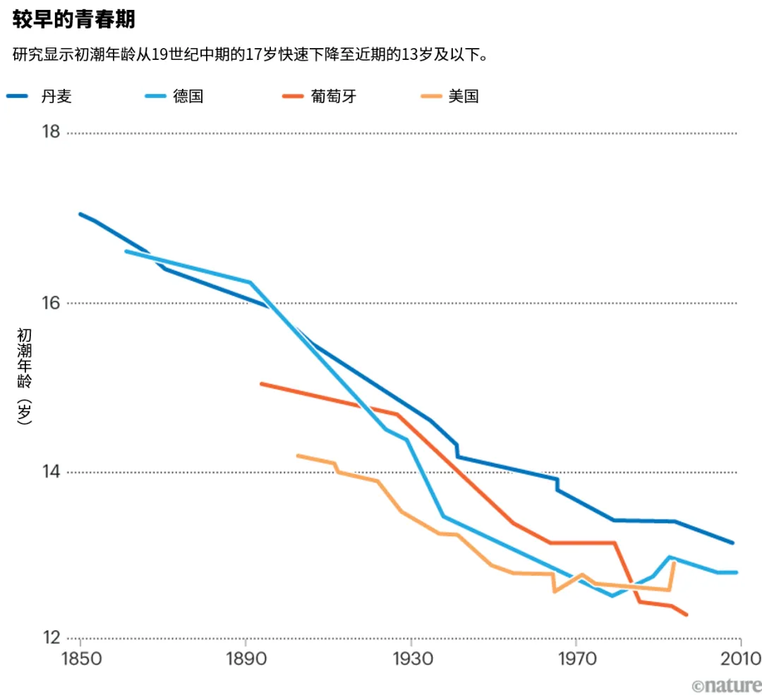 19世纪中期,初潮平均年龄下降,这常被归因于健康状况改善,如传染病和营养不良减少(见“更早的青春期”)。这可能加速了生长发育和性成熟。大多数研究者假定,此后青春期时间基本保持稳定。“20世纪60年代的研究表明,初潮年龄基本稳定在12岁半左右。”美国国家儿童医院的退休儿科内分泌学家Paul Kaplowitz说。