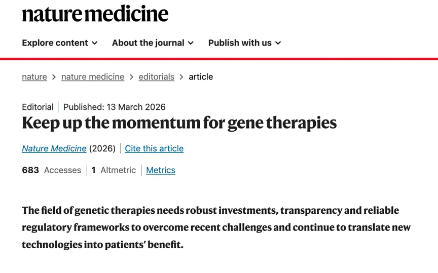 本文原标题为“Keep up the momentum for gene therapies ”,2026年 3月13日在线发表于Nature medicine。