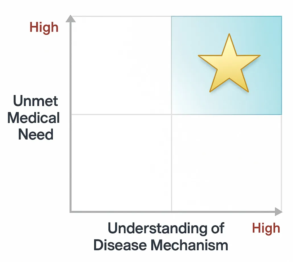 当被问到研究战略时,菲什曼画出了一个 2×2 矩阵:一条轴是“未满足的医疗需求”,另一条轴是“机制理解”。最理想的位置在右上角:为迫切需要治疗的患者开发具有清晰生物学机制的药物。