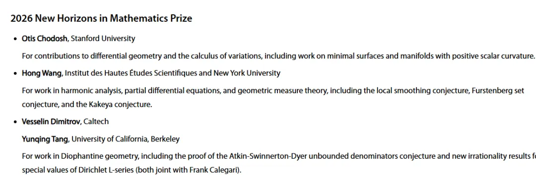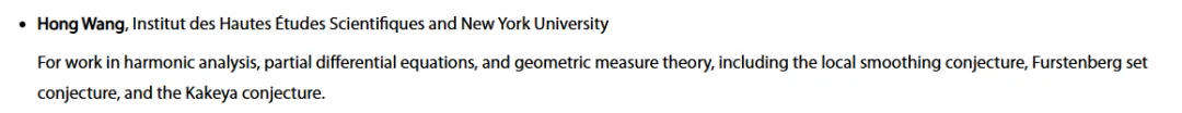 就在几天前,王虹刚刚获得了另一项数学界重磅大奖——2026年克雷研究奖(Clay Research Awards)。短短五天内连获两大“菲奖风向标”级荣誉,实属罕见。